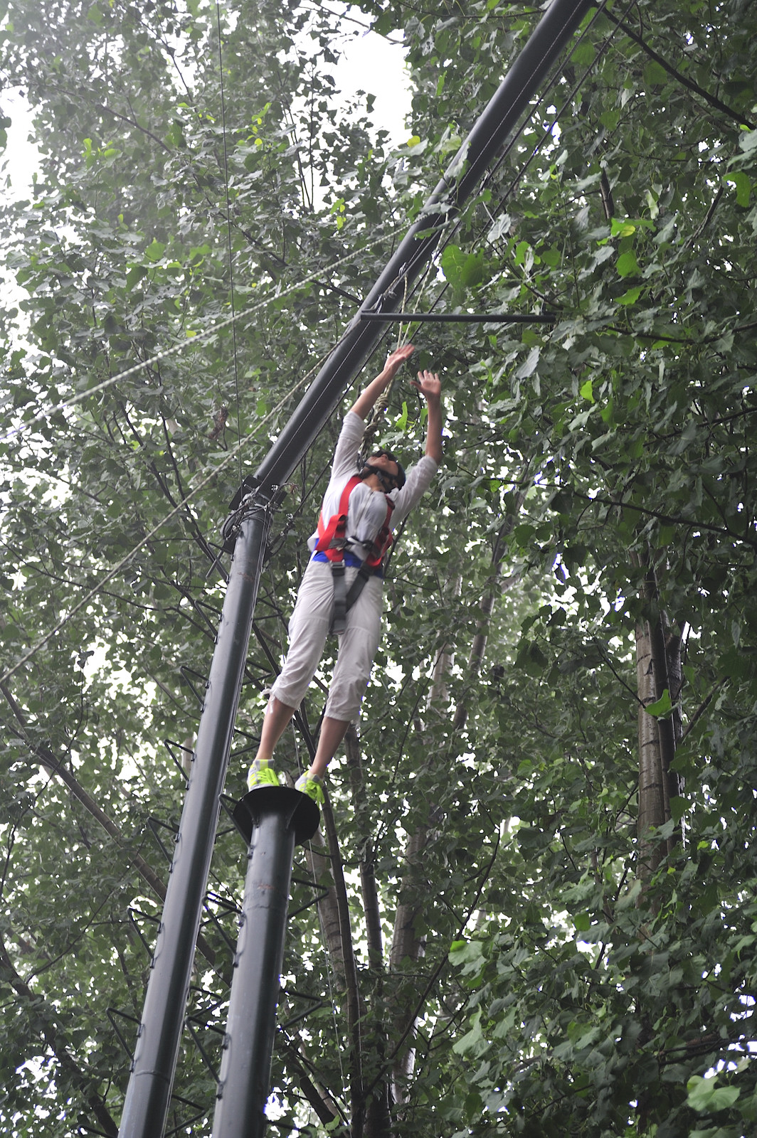 第一项,空中抓杠。独自爬上8米高的圆柱,站在圆柱顶的圆盘上,向前方奋力一跃,抓住高空中悬吊着的单杠。两队人马既不想输给对方,又为自己队里的女孩子们担心:她们能完成这项任务吗?可是结果出人意料!带队的旗手试了一下顺利完成之后,两队的女孩们便纷纷冲在前面,一马当先就爬上了圆柱,看的其他男队员们咂舌不已,纷纷说咱们中隧的姑娘们真勇敢,真有魄力啊。遇到有恐高症的队员在圆柱上踌躇不前的时候,大家就一起在下面呐喊助威,给对方鼓劲儿,暗暗地在手心里捏一把汗。虽然过程惊心动魄,但很快的,两队人马都通过了抓杠的项目,教练在下面乐呵呵的说:“给你们做这个项目真是太轻松了,一会儿工夫就都做完了,我给其他公司做训练的时候,有人蹲在上面40分钟不敢站起来,能急死你!”