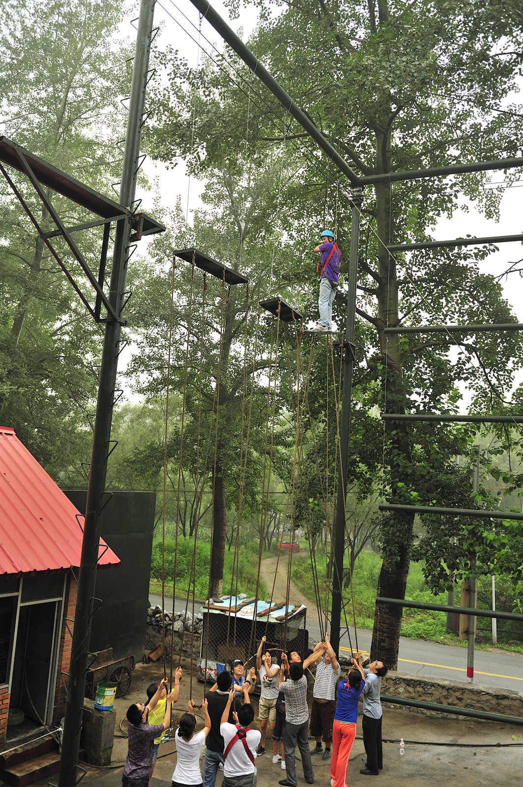 下午进行的是第二项,合力过桥。高空中悬吊着三块20公分宽100公分长的薄板,中间隔出一段距离,排成一横排。第一块板只有一根钢绳吊着,形成倒T字型,第二块板有两根,形成一个三角形,第三块板也是两根,形成一个四边形。三块薄板的下方都有6根麻绳垂下来,需要下面的队友拉住麻绳,力量传递到薄板上,尽量使薄板不晃荡,并控制两边的薄板可以对接,让队员能跨过去。这个可比空中抓杠要危险多了,上面的薄板很容易前后左右摇晃,让过桥的队员非常没有安全感。但是很多队员都表示实际做完以后,感觉比空中抓杠容易,因为知道下面有队友在拉着麻绳,在出力,在固定薄板的位置,心里就暖暖的,特别踏实,就不会害怕前面的困难和危险,放心大胆地跨过这“断桥”。大家都觉得这个项目太考验团队的协作能力了,如果没有大家的努力,凭自己去完成真的太难太难了。