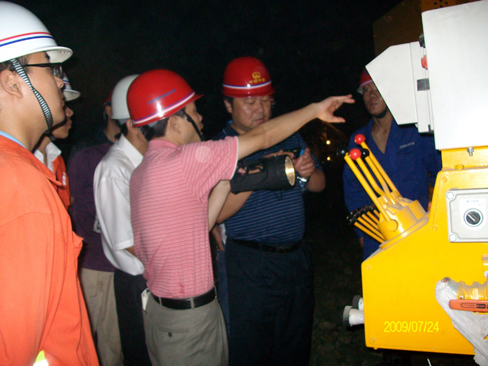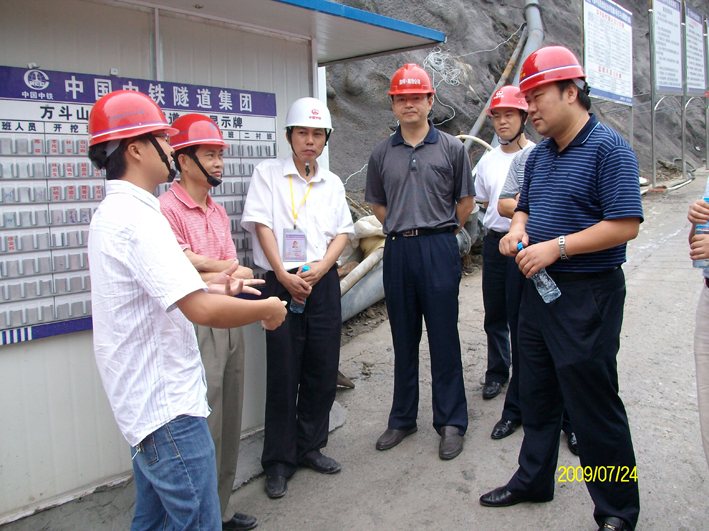 渝黔铁路领导在方斗山隧道正洞内非常感兴趣地仔细询问价值400万的RAD-150C型号地质超前预报钻孔台车的工作性能和超前地质预报工作的开展情况。