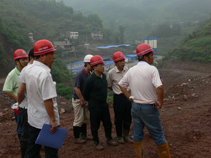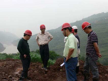 2009年5月12日到14日,集团公司唐副总经理亲临渝利项目进行现场调研。唐总在渝利项目经理部项目经理王小平、项目副经理耿伟以及北京中隧公司董事长髙体文、渝利项目二分部书记赵国华的陪同下,不顾雨后道路泥泞和山路的险峻,亲临各个工点进行检查指导。图为唐总在我公司承担的胡家坡隧道出口工地现场调研。