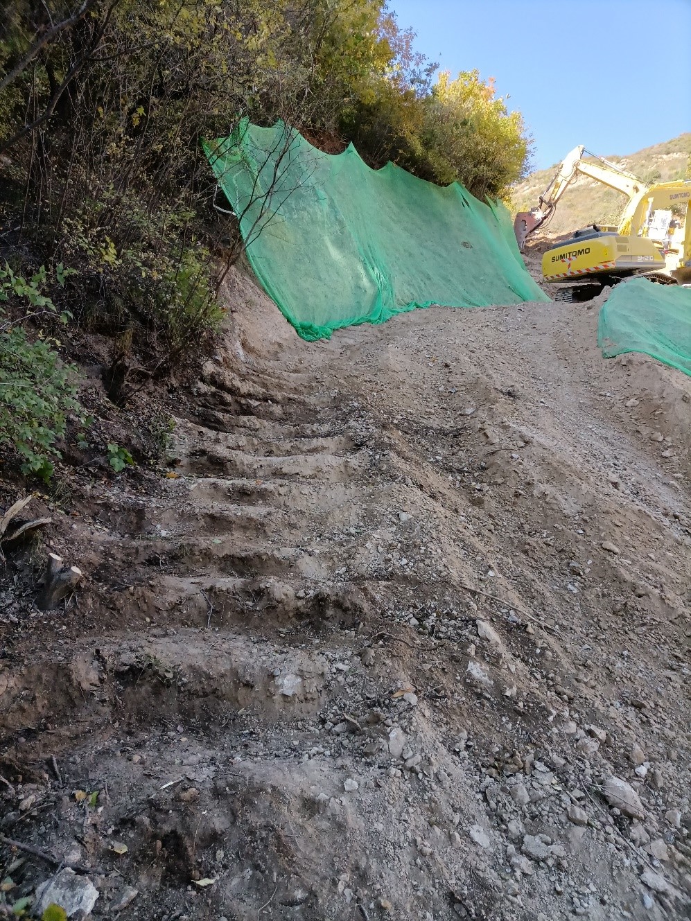 小龙门隧道洞口处于半山腰,场地狭窄、地形陡峭,这给便道的修建带来了很大的困难,经多次测量和实地勘察,我们最终决定先在国道路口偏左洞的山边修建一条简易施工便道。便道是通了,但洞口和下面的平地高差达15米,施工设备如何通过狭窄陡峭的便道运到洞口呢?思前想后,只能“愚公移山”了。大型设备、钢材通过挖掘机、装载机倒运到洞口,其它小型材料靠工人肩挑背扛运送至施工现场。