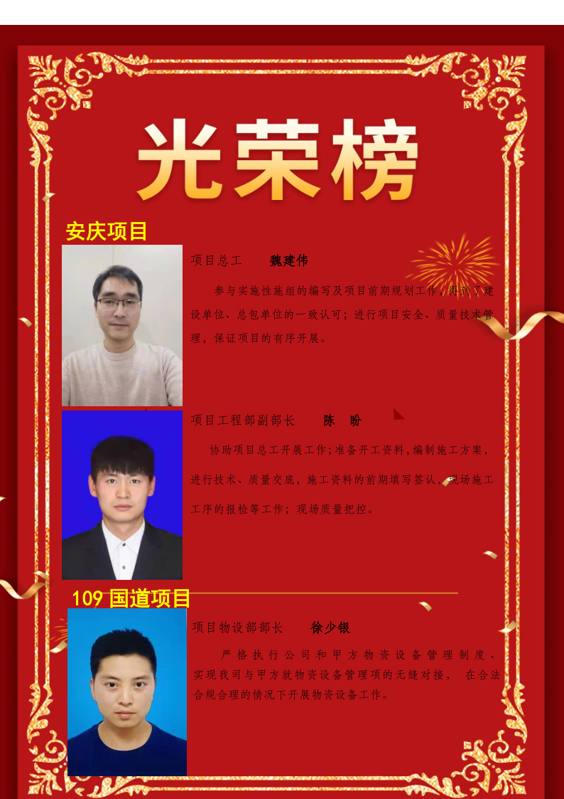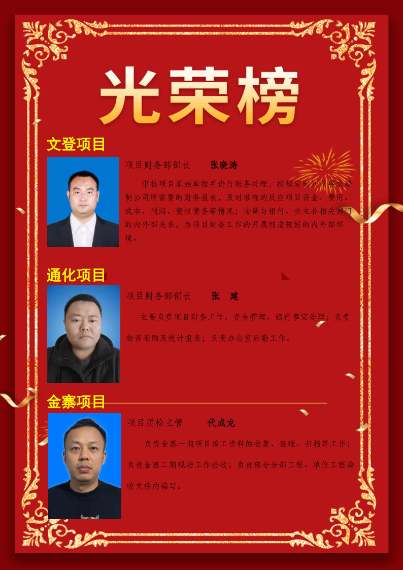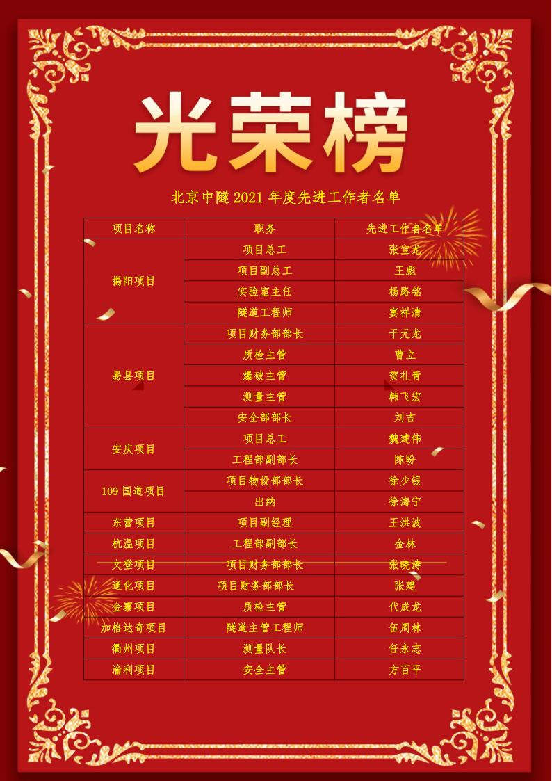 2021年公司业务突飞猛进,各项目众志成城、攻坚克难,各项工作取得了阶段性胜利,并涌现出一批兢兢业业、勤勤恳恳、积极进取的先进工作者。 为树立榜样,进一步激发基层活力,激励广大员工奋发向上、奋力拼搏,在企业内部形成良好的工作氛围,推动各项工作迈向新台阶,经各项目经理部民主评选和公司相关领导考核,决定对张宝龙、王洪波、魏建伟、刘吉等21位同志授予“2021年度先进工作者”荣誉称号,并进行奖励。