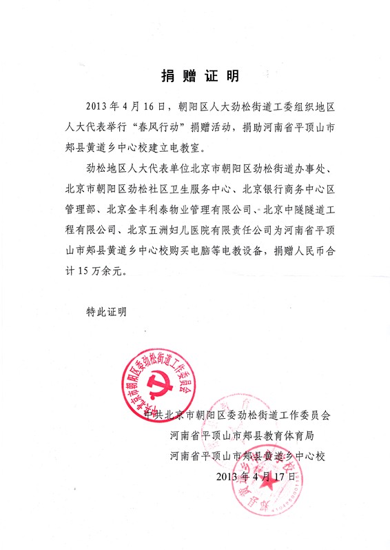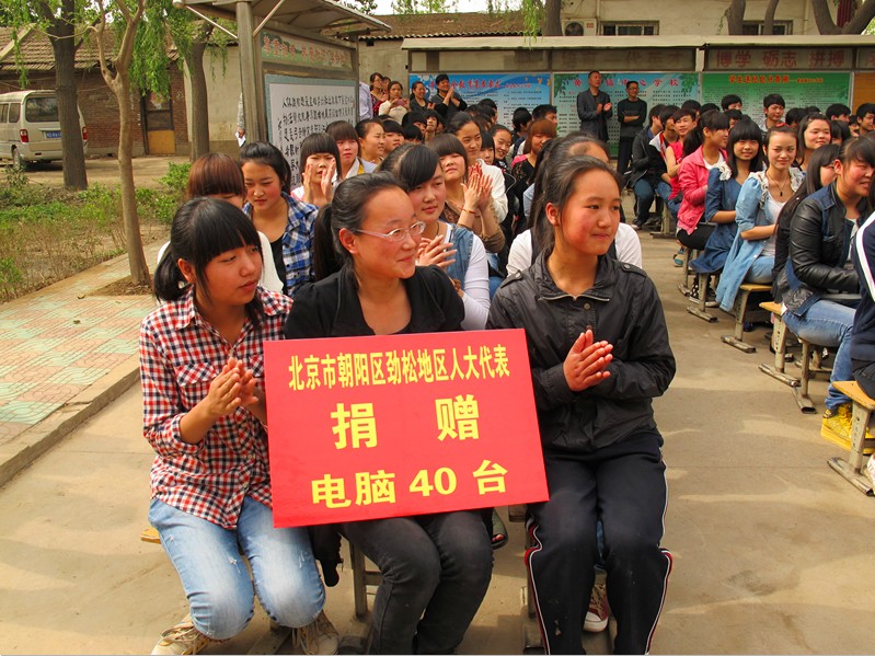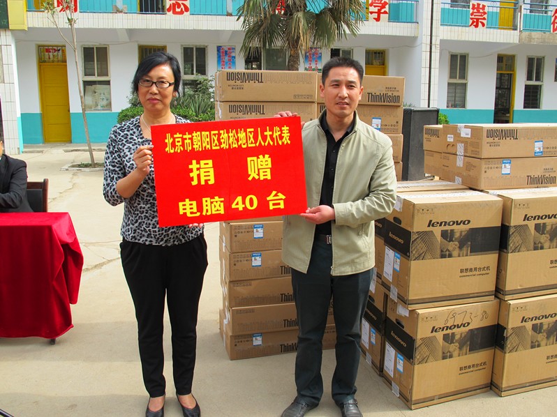 河南省平顶山市郏县黄道镇位于伏牛山区,中心校有600多名学生,学校经费欠缺,教学硬件设施差,全校仅有1台电脑用于教职工日常工作。在得知这一消息后,公司董事长高体文先生颇为关注,积极响应,大力支持劲松工委发起的“春风行动”,慷慨解囊捐赠10台电脑帮助河南省平顶山市郏县黄道乡中心校建立电教室。