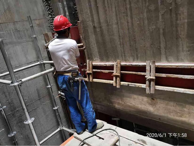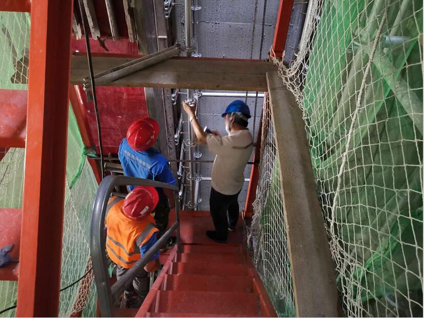 前期施工中,由于闸门门轨的预埋安装尺寸偏差控制严格,稍有疏忽,便会造成下放卡阻或者门叶门轨不密贴等棘手问题。针对以上情况,我公司金寨项目部从勤测量、多检查等方面着手,精控过程质量,并创新采用定制的安全笼梯下放到闸门井内,配合盘扣式脚手架,跟随作业面同步上升,为作业人员提供稳定坚实的作业平台,既有效保障了作业安全又精准控制了门轨安装偏差、保证了门槽二期混凝土的浇筑质量,最终确保门叶下放工作优质达标地圆满完成。