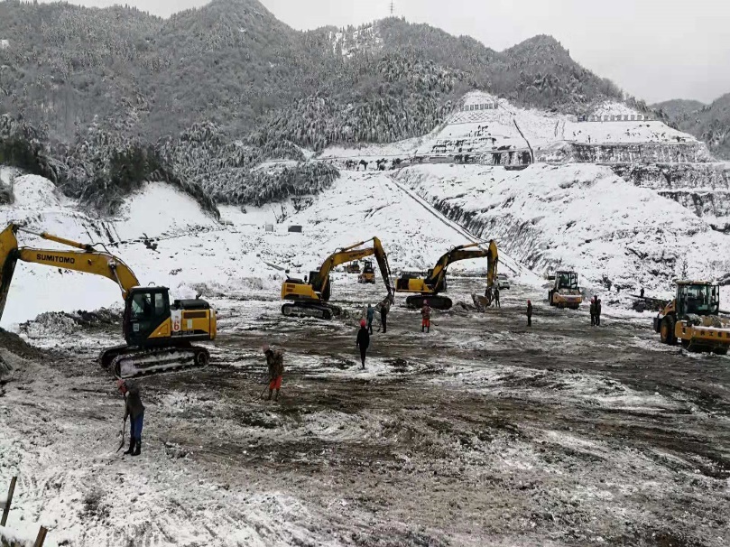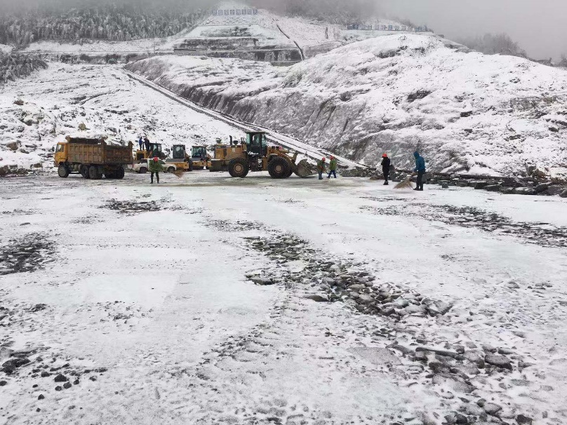 2018年12月~2019年1月期间,整个金寨地区经历多场大雪天气,而上水库区域由于海拔较高,雪势格外猛烈,大坝填筑面被大雪覆盖,填筑道路结冰打滑。为确保大坝填筑顺利进行,项目部组织全体人员和机械设备进行了多场除雪工作,大家齐心协力,顶着凌冽的寒风,一锹一锹地铲,一帚一帚地扫,最终使降雪对填筑施工的影响降到了最小化。