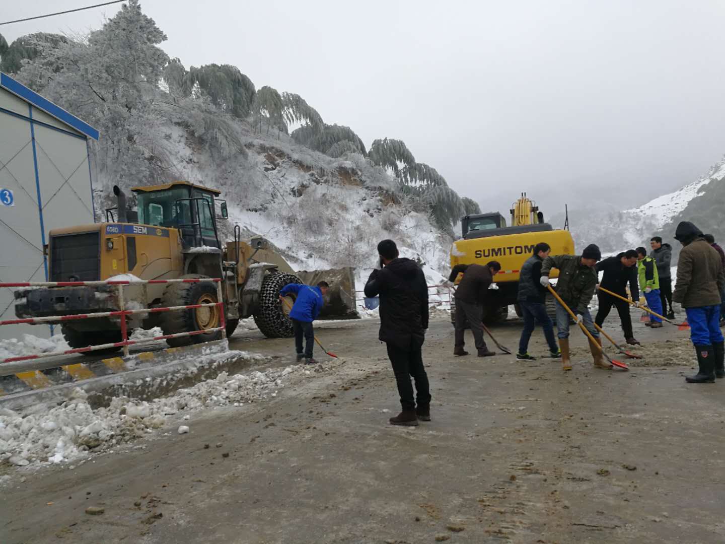 项目领导第一时间带领人员出动对营地活动板房逐一进行排查并加固,避免了更为危险的情况发生。在停水、停电、停网络的暴雪灾难里项目人员没有一个人抱怨过一句苦累,而是都以团结一致、坚持信念的状态面对这场暴雪带来的灾难,随处可见这样的镜头:“中隧人把责任扛在肩,天气恶劣始终没有退缩”。暴雪一停,项目领导人及干部立即组织人员、机械设备开展“保交通恢复生产的大除雪运动”,项目经理带领20余人负责指挥和巡查相关危险部位的人员、设备情况,做好安全防护工作,使主要场地内及通往乡镇道路逐渐畅通。
